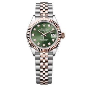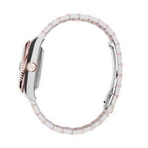Son design bicolore gris et rose s’harmonise parfaitement avec son cadran vert, offrant une touche moderne et distinguée.